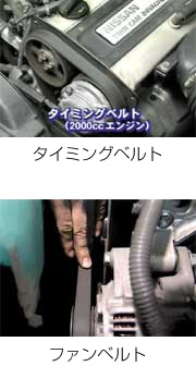 ベルト類の交換。エンジンには幾つかのベルトが付いてます。大きいものではタイミングベルト、これは約10万キロに一度交換するものですから、しょっちゅう気にするものではありませんが、その他のベルト、ファンベルトやパワーステリングベルトは3万キロから6万キロで交換です。